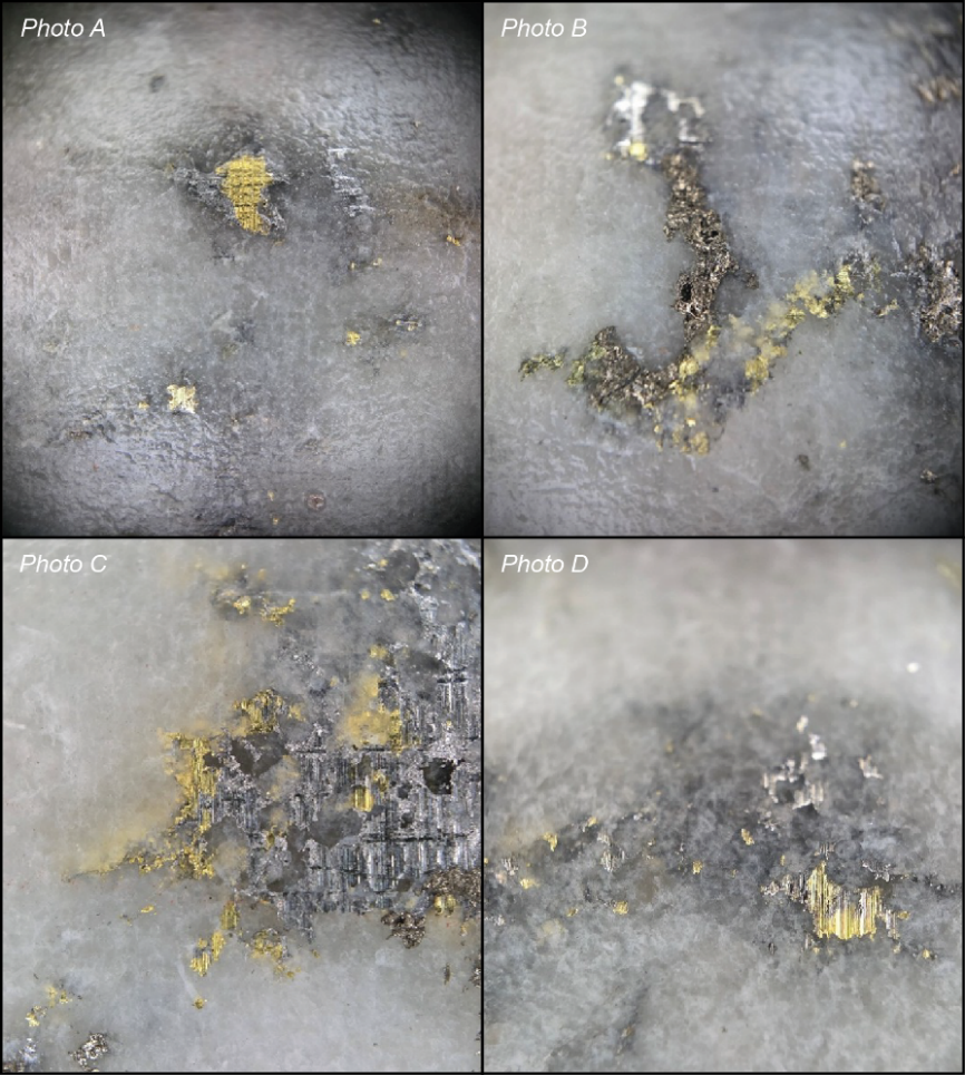 At 287.32 m down hole, below the most intense widespread alteration and mineralization, drilling intersected a low angle (10-30° to core axis) irregular quartz vein, approximately 10 cm wide, hosting visible gold and bismuthinite, along with disseminated to semi-massive pyrrhotite, pyrite, chalcopyrite, arsenopyrite, molybdenite, and sphalerite (Photos 1,2&5). Core sampling of the quartz vein returned 1.25 m grading 105 g/tonne gold. Immediately preceding this sample, a second cm-scale quartz vein hosting visible gold in altered and veined granodiorite returned 1.15 m grading 8.85 g/t gold. In the footwall of the coarse gold-bearing veins, 288.50-289.15 m interval, narrow sulphide stringers returned 0.75 m grading 0.47 g/tonne gold.