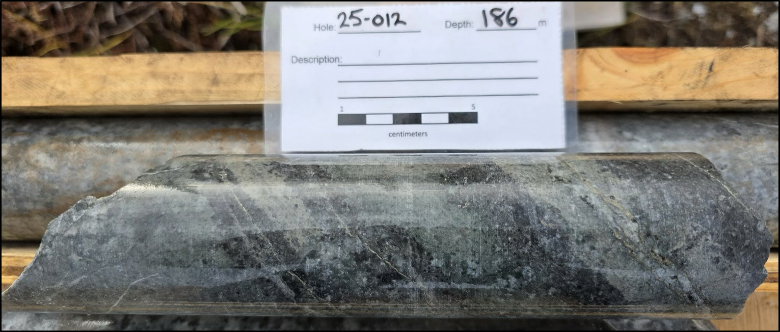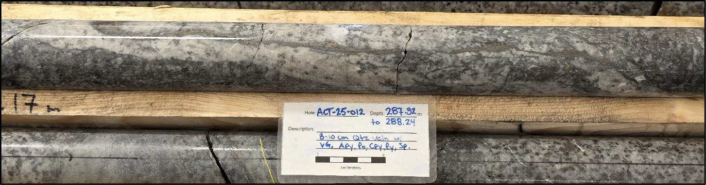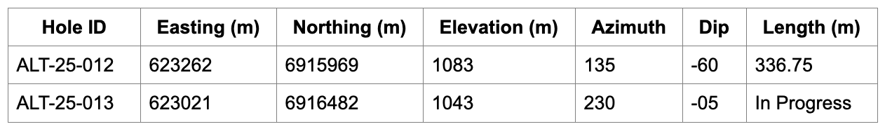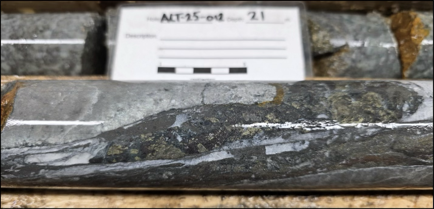 Hole ALT-25-012 was collared 215 m to the west of holes ALT-25-008 and ALT-25-009, both of which were drilled during Phase I drilling. At 287.32 m down hole, drilling intersected a low angle to core axis, quartz vein (approximately 10 cm wide) hosting numerous grains of visible gold and bismuthinite, along with disseminated to semi-massive pyrrhotite, pyrite, chalcopyrite, arsenopyrite, molybdenite and sphalerite (Photo 1, Photo 2 and Figure 1).