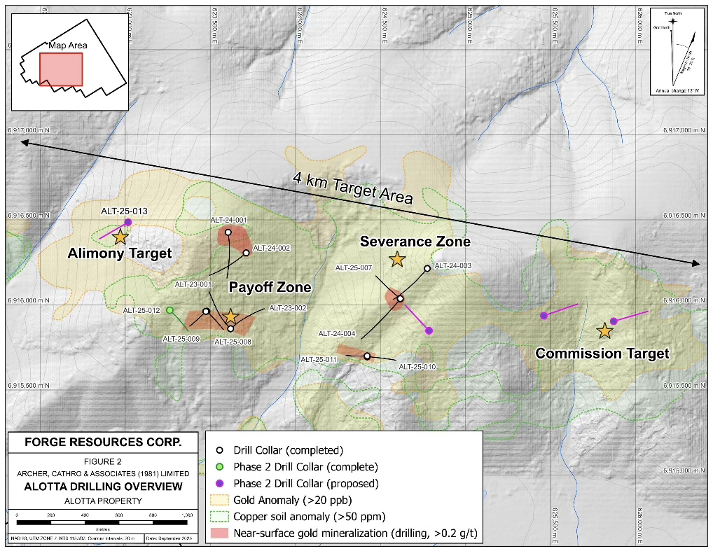 Vancouver, British Columbia -- (Newsfile Corp. – September 30, 2025) - Forge Resources Corp. (CSE: FRG) (OTCQB: FRGGF) (FSE: 5YZ) ("FRG" or the "Company"), is pleased to announce initial observations of mineralization from the first diamond drill hole of the Phase II, 2025 drill program at the Alotta gold-copper porphyry property. ALT-25-012 intersected polymetallic veins, with one containing numerous grains of coarse visible gold. Drilling is currently underway at the Alimony Target, and the Company expects to complete an additional 3-4 holes during this program.